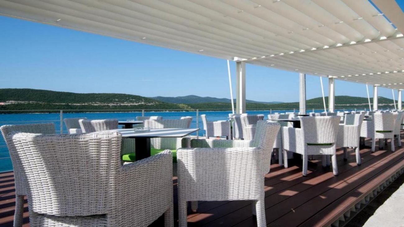 Тераса с прекрасна гледка към морето, където гостите могат да се насладят на напитки или просто да релаксират.